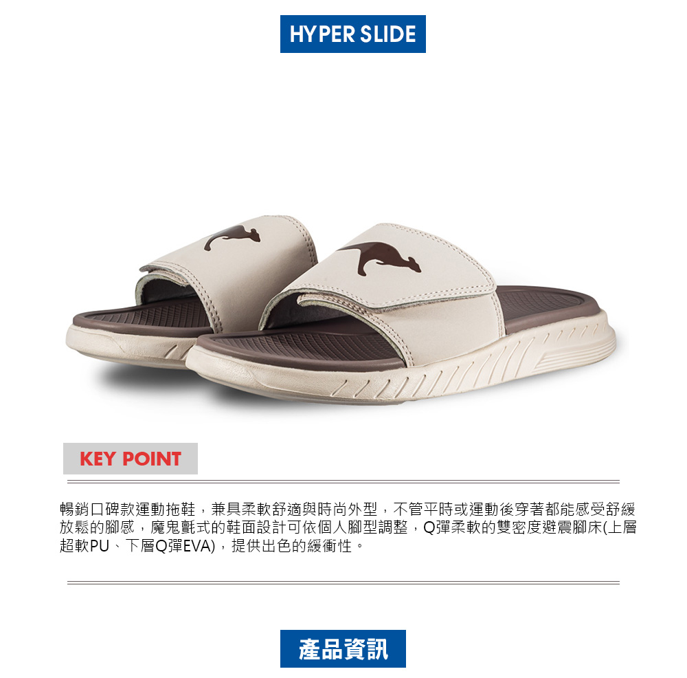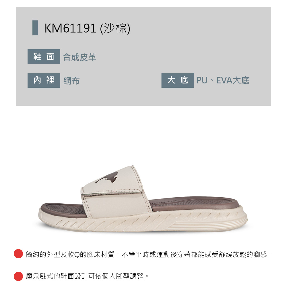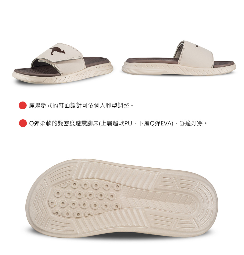 1.簡約的外型及軟Q的腳床材質,不管平時或運動後穿著都能感受舒緩放鬆的腳感。2.魔鬼氈式的鞋面設計可依個人腳型調整。3.Q彈柔軟的雙密度避震腳床(上層超軟PU、下層Q彈EVA),舒適好穿。